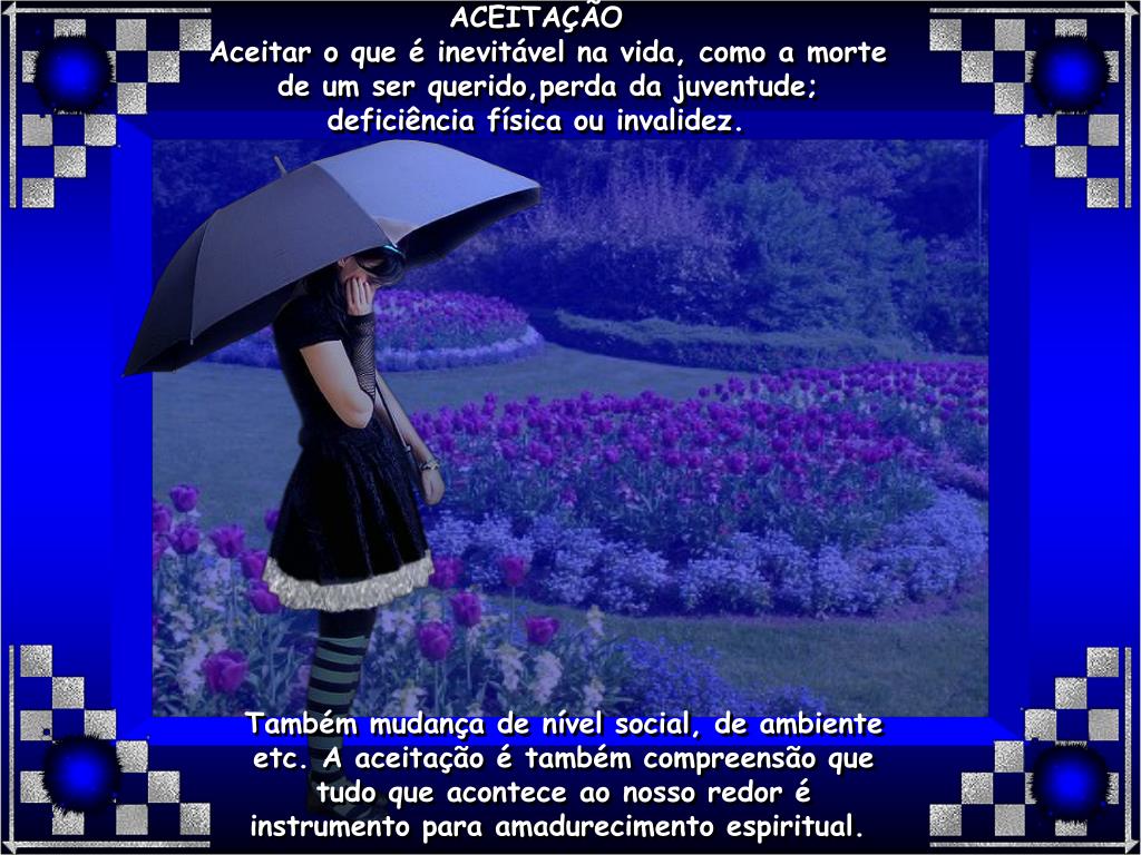 ACEITAÇÃO Aceitar o que é inevitável na vida, como a morte de um ser querido,perda da juventude; deficiência física ou invalidez. Também mudança de nível social, de ambiente etc. A aceitação é também compreensão que tudo que acontece ao nosso redor é instrumento para amadurecimento espiritual.