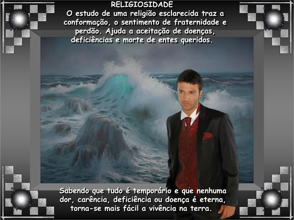 RELIGIOSIDADE O estudo de uma religião esclarecida traz a conformação, o sentimento de fraternidade e perdão. Ajuda a aceitação de doenças, deficiências e morte de entes queridos. Sabendo que tudo é temporário e que nenhuma dor, carência, deficiência ou doença é eterna, torna-se mais fácil a vivência na terra.