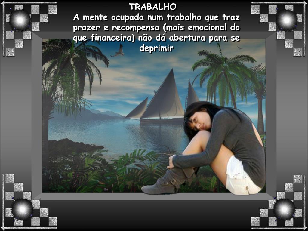 TRABALHO A mente ocupada num trabalho que traz prazer e recompensa (mais emocional do que financeira) não dá abertura para se deprimir