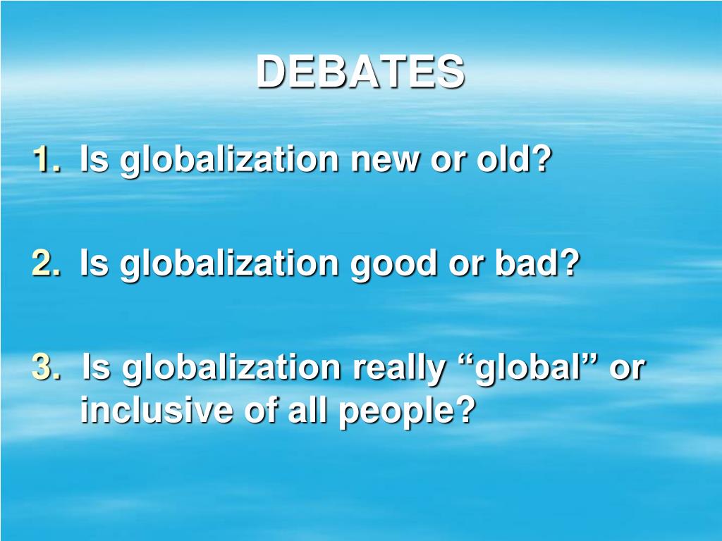 DEBATES • Is globalization new or old? • Is globalization good or bad? 3. Is globalization really “global” or inclusive of all people?