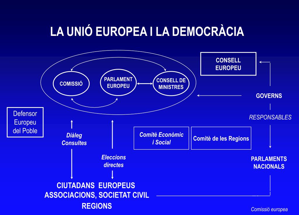 33. LA UNIÓ EUROPEA I LA DEMOCRÀCIA CONSELLEUROPEU PARLAMENTEUROPEU CONSELL DEMINISTRES COMISSIÓ GOVERNS DefensorEuropeu del Poble RESPONSABLES DiàlegConsultes Comitè Econòmici Social Comitè de les Regions Eleccionsdirectes PARLAMENTSNACIONALS CIUTADANS EUROPEUS ASSOCIACIONS, SOCIETAT CIVIL REGIONS Comissió europea