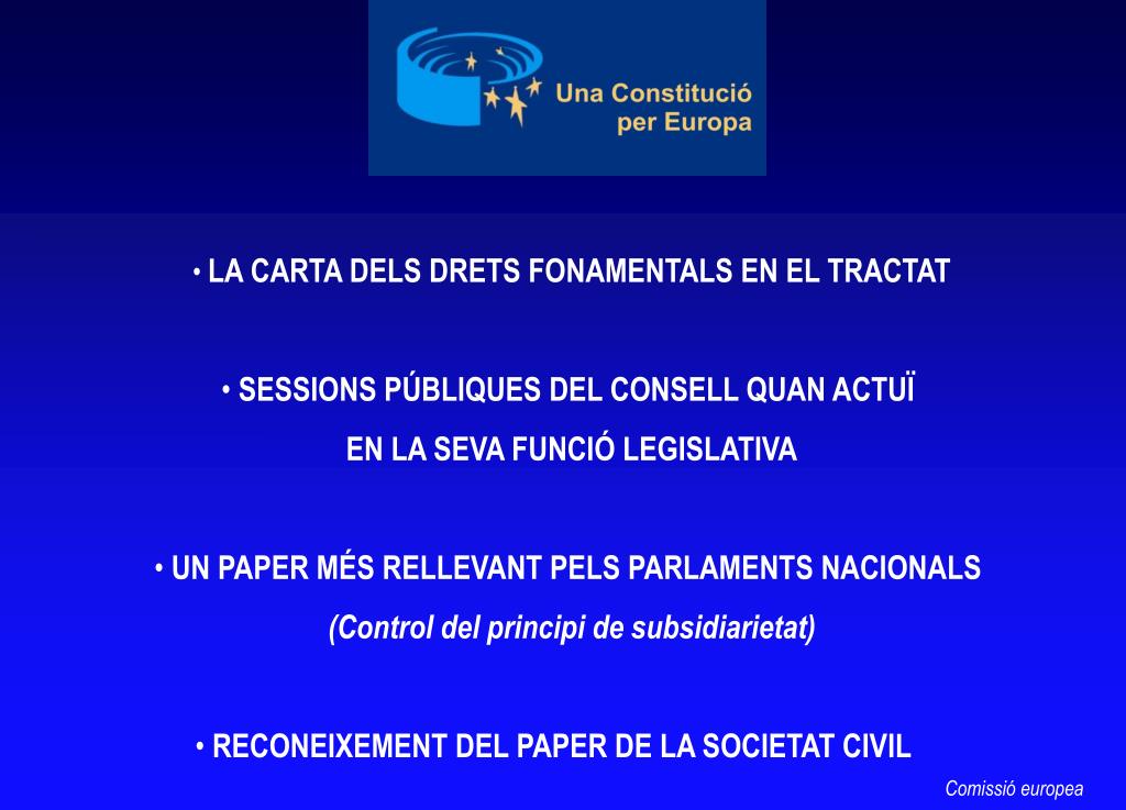 6. LA CARTA DELS DRETS FONAMENTALS EN EL TRACTAT • SESSIONS PÚBLIQUES DEL CONSELL QUAN ACTUÏ • EN LA SEVA FUNCIÓ LEGISLATIVA • UN PAPER MÉS RELLEVANT PELS PARLAMENTS NACIONALS • (Control del principi de subsidiarietat) • RECONEIXEMENT DEL PAPER DE LA SOCIETAT CIVIL Comissió europea