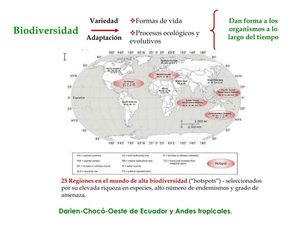 Variedad • Formas de vida • Procesos ecológicos y evolutivos Dan forma a los organismos a lo largo del tiempo Biodiversidad Adaptación 25 Regiones en el mundo de alta biodiversidad (“hotspots”) - seleccionados por su elevada riqueza en especies, alto número de endemismos y grado de amenaza. Darien-Chocó-Oeste de Ecuador y Andes tropicales.