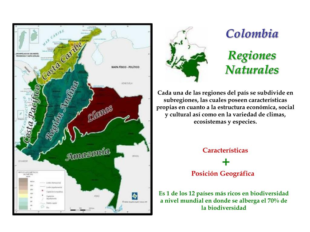 Colombia Regiones Naturales Cada una de las regiones del país se subdivide en subregiones, las cuales poseen características propias en cuanto a la estructura económica, social y cultural así como en la variedad de climas, ecosistemas y especies. Características + Posición Geográfica Es 1 de los 12 países más ricos en biodiversidad a nivel mundial en donde se alberga el 70% de la biodiversidad