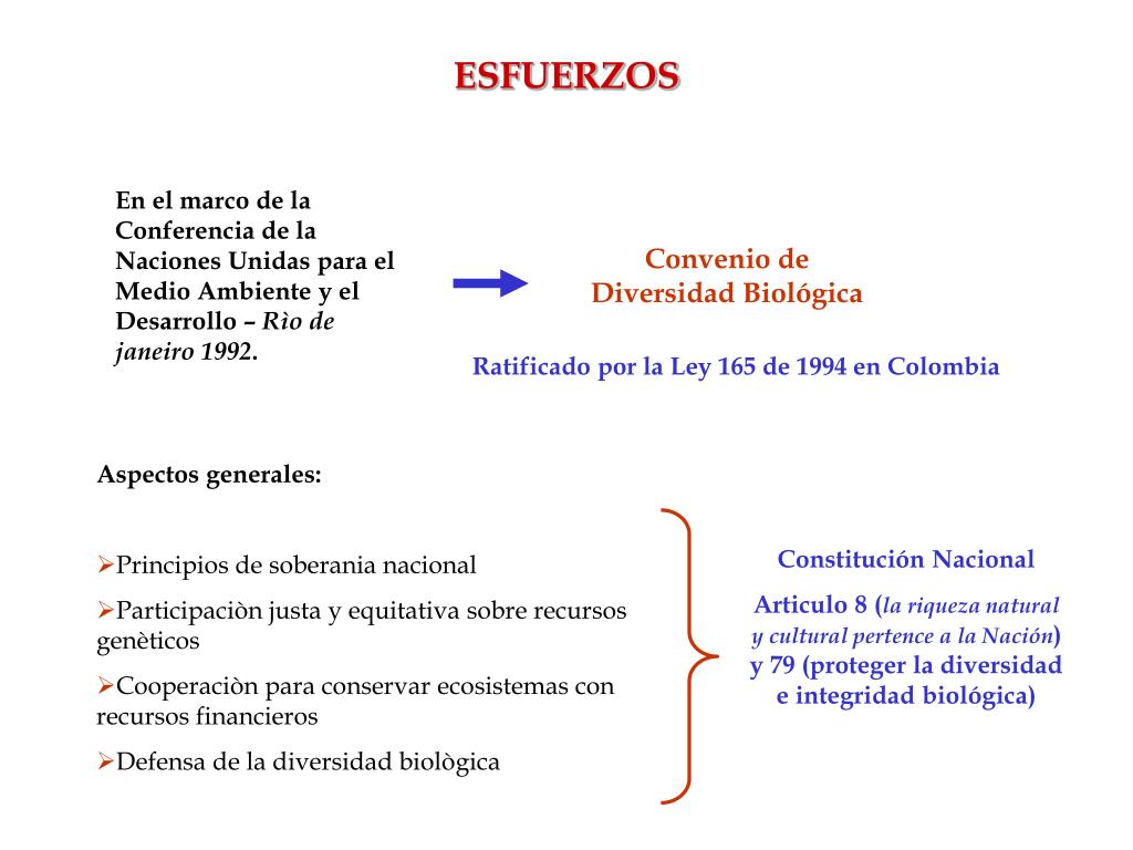 ESFUERZOS En el marco de la Conferencia de la Naciones Unidas para el Medio Ambiente y el Desarrollo – Rìo de janeiro 1992. Convenio de Diversidad Biológica Ratificado por la Ley 165 de 1994 en Colombia • Aspectos generales: • Principios de soberania nacional • Participaciòn justa y equitativa sobre recursos genèticos • Cooperaciòn para conservar ecosistemas con recursos financieros • Defensa de la diversidad biològica Constitución Nacional Articulo 8 (la riqueza natural y cultural pertence a la Nación) y 79 (proteger la diversidad e integridad biológica)
