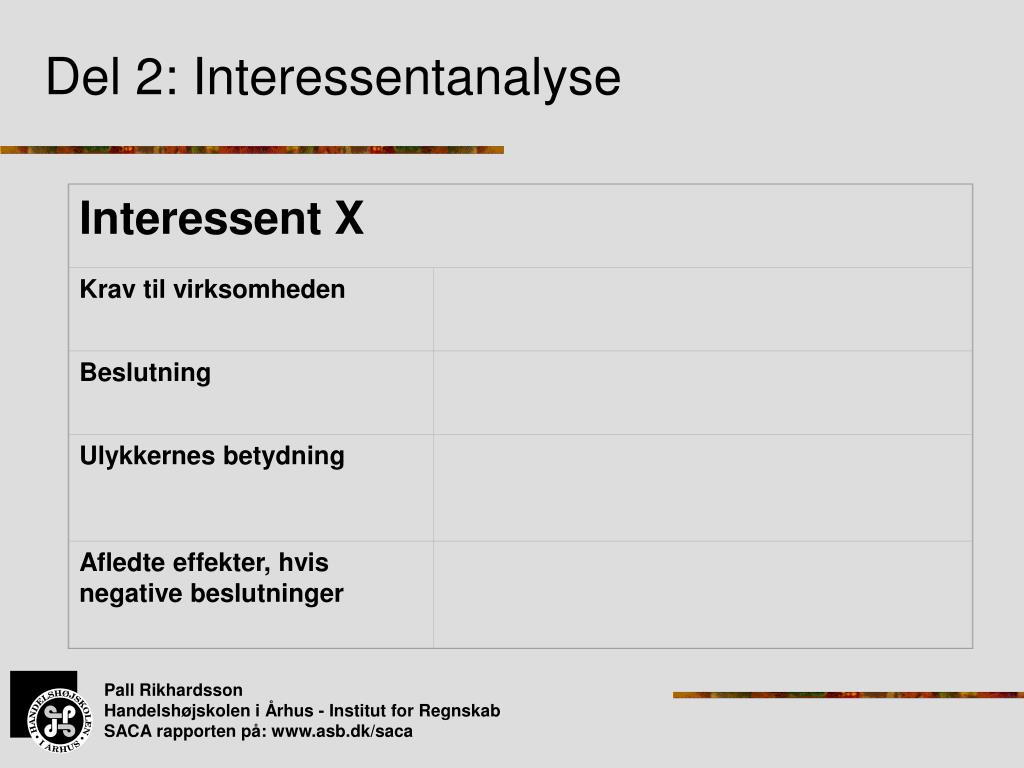 Interessent X Krav til virksomheden Beslutning Ulykkernes betydning Afledte effekter, hvis negative beslutninger Del 2: Interessentanalyse