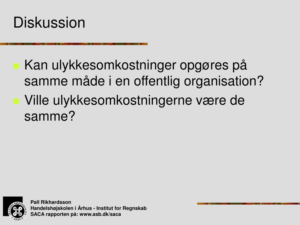Diskussion • Kan ulykkesomkostninger opgøres på samme måde i en offentlig organisation? • Ville ulykkesomkostningerne være de samme?