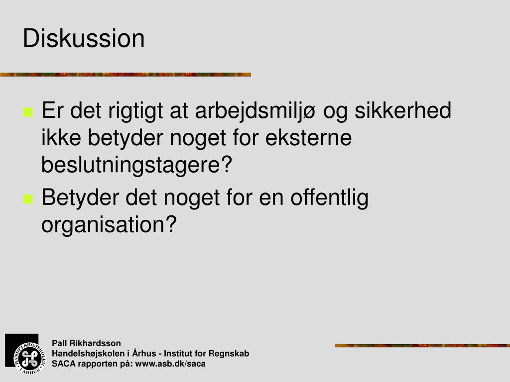 Diskussion • Er det rigtigt at arbejdsmiljø og sikkerhed ikke betyder noget for eksterne beslutningstagere? • Betyder det noget for en offentlig organisation?