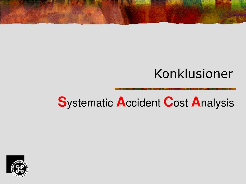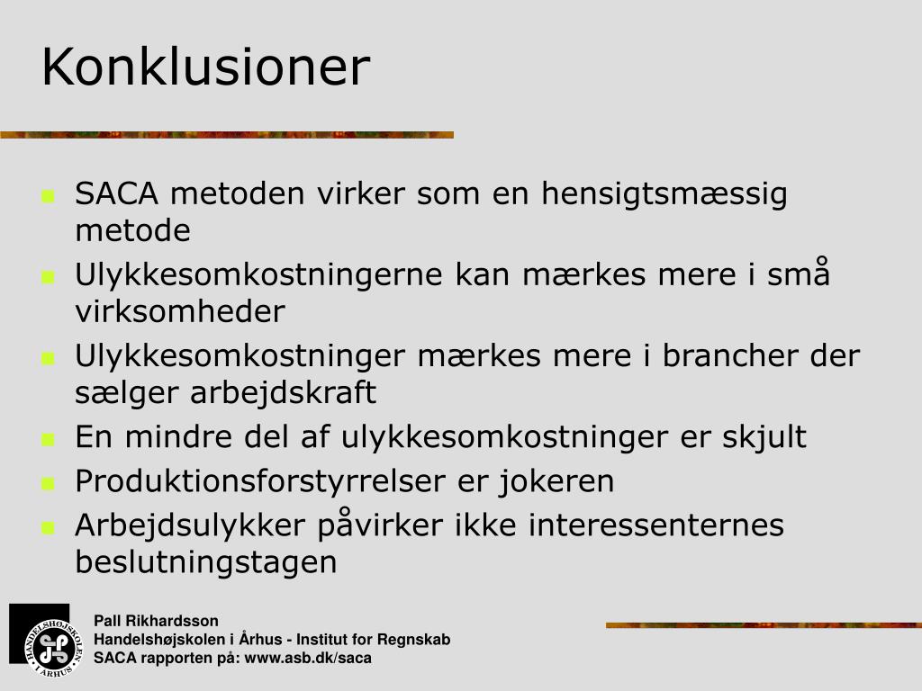 Konklusioner • SACA metoden virker som en hensigtsmæssig metode • Ulykkesomkostningerne kan mærkes mere i små virksomheder • Ulykkesomkostninger mærkes mere i brancher der sælger arbejdskraft • En mindre del af ulykkesomkostninger er skjult • Produktionsforstyrrelser er jokeren • Arbejdsulykker påvirker ikke interessenternes beslutningstagen