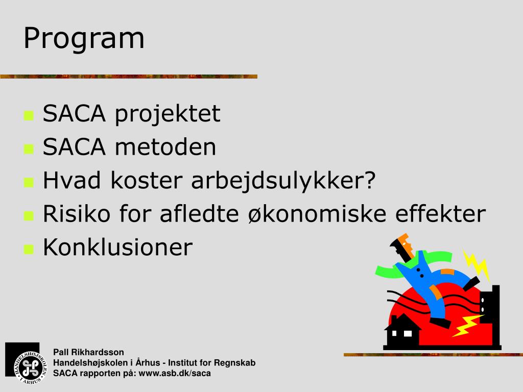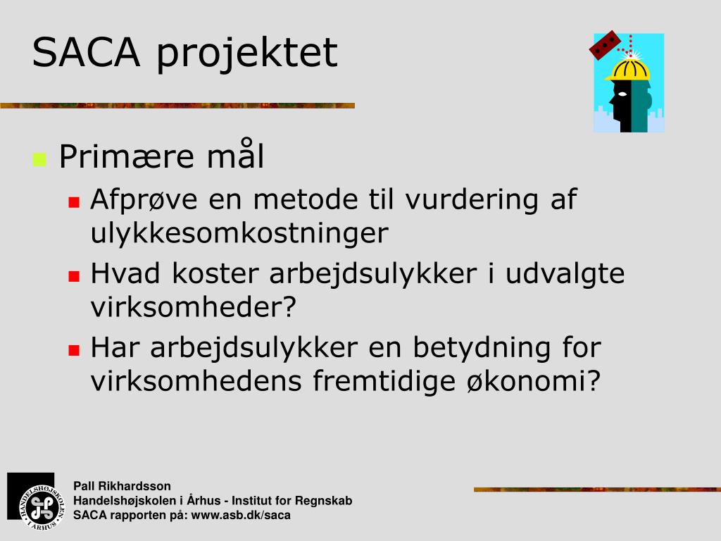 Forsvarets Bedriftssundhedscenter SYD Arbejdsmiljøseminar 23/10 2002. Hvad koster en arbejdsulykke?. Pall Rikhardsson Handelshøjskolen i Århus Institut for Regnskab Fuglesangs Allé 4 8210 Å rhus V e-mail: par@asb.dk. ettffssont ettffss ? nt. Program. SACA projektet SACA metoden