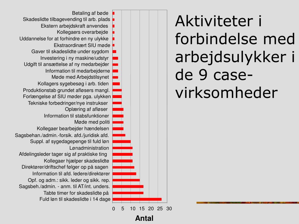 Betaling af bøde Skadeslidte tilbagevending til arb. plads Ekstern arbejdskraft anvendes Kollegaers overarbejde Uddannelse for at forhindre en ny ulykke Ekstraordinært SIU møde Gaver til skadeslidte under sygdom Investering i ny maskine/udstyr Udgift til ansættelse af ny medarbejder Information til medarbejderne Møde med Arbejdstilsynet Kollagers sygebesøg i arb. tiden Produktionstab grundet afløsers mangl. Forlængelse af SIU møder pga. ulykken Tekniske forbedringer/nye instrukser Oplæring af afløser Information til stabsfunktioner Møde med politi Kollegaer bearbejder hændelsen Sagsbehan./admin.-forsik. afd./juridisk afd. Suppl. af sygedagepenge til fuld løn Lønadministration Afdelingsleder tager sig af praktiske ting Kollegaer hjælper skadeslidte Direktører/driftschef følger op på sagen Information til afd. ledere/direktører Opf. og adm.: sikk. leder og sikk. rep. Sagsbeh./admin. - anm. til AT/int. unders. Tabte timer for skadeslidte på Fuld løn til skadeslidte i 14 dage 5 10 15 20 25 30 0 Antal Aktiviteter i forbindelse med arbejdsulykker i de 9 case- virksomheder