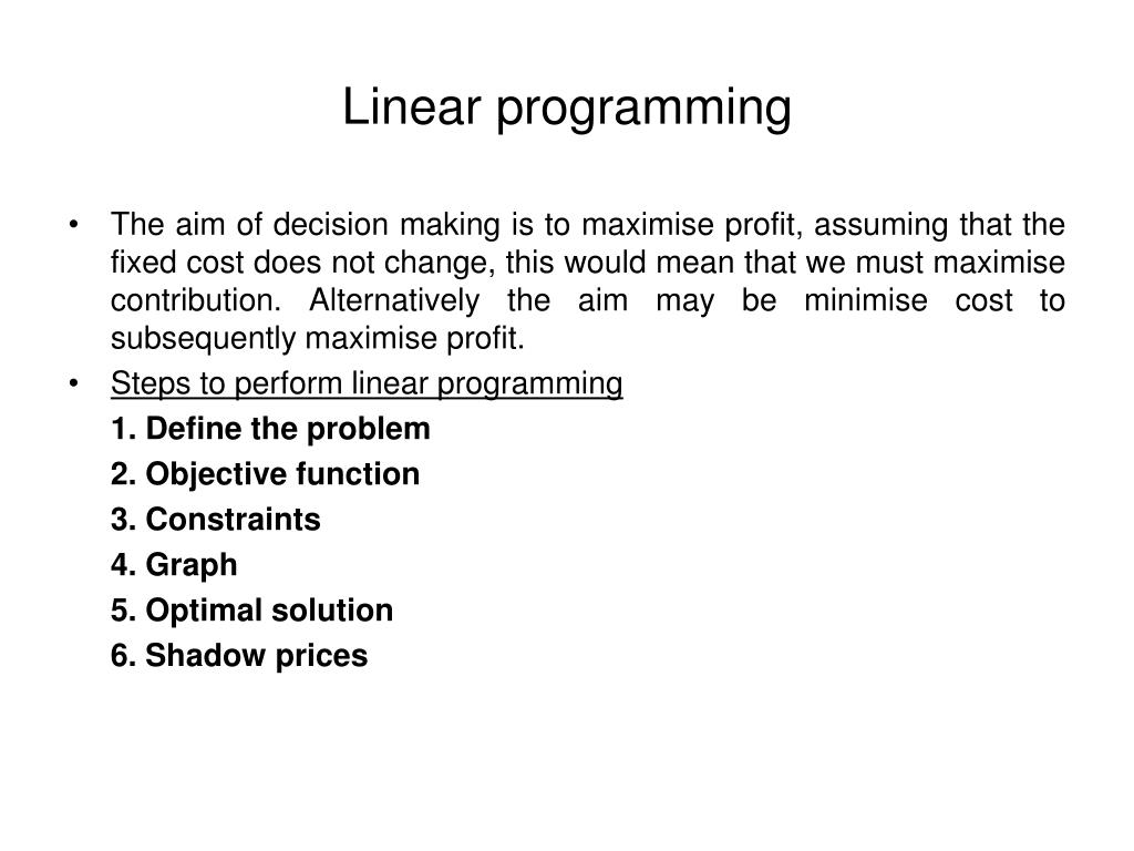 Linear programming • The aim of decision making is to maximise profit, assuming that the fixed cost does not change, this would mean that we must maximise contribution. Alternatively the aim may be minimise cost to subsequently maximise profit. • Steps to perform linear programming 1. Define the problem 2. Objective function 3. Constraints 4. Graph 5. Optimal solution 6. Shadow prices