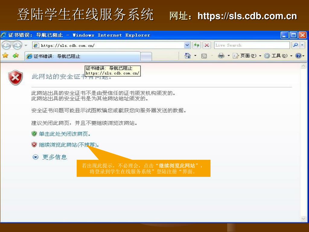 登陆学生在线服务系统 网址:https://sls.cdb.com.cn 在IE地址栏输入: https://sls.cdb.com.cn 按“回车”(ENTEN)键 双击“IE”浏览器 若出现此提示,不必理会,点击“继续浏览此网站”,将登录到学生在线服务系统”登陆注册“界面。
