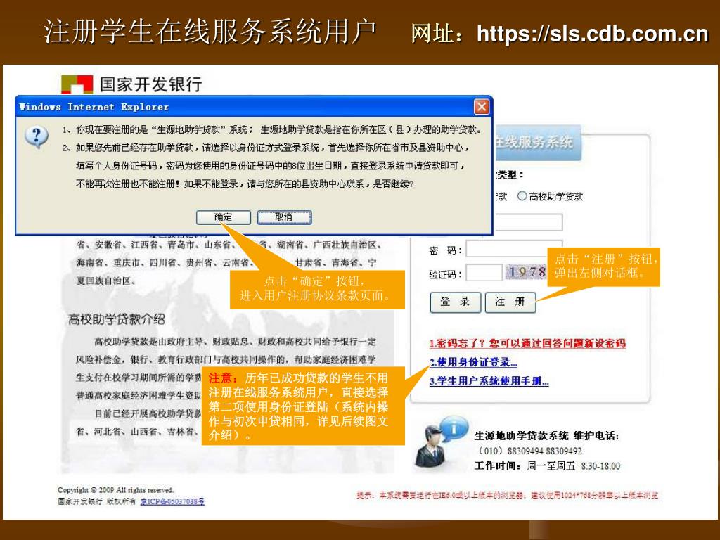 注册学生在线服务系统用户 网址:https://sls.cdb.com.cn 点击“注册”按钮,弹出左侧对话框。 点击“确定”按钮, 进入用户注册协议条款页面。 注意:历年已成功贷款的学生不用注册在线服务系统用户,直接选择第二项使用身份证登陆(系统内操作与初次申贷相同,详见后续图文介绍)。