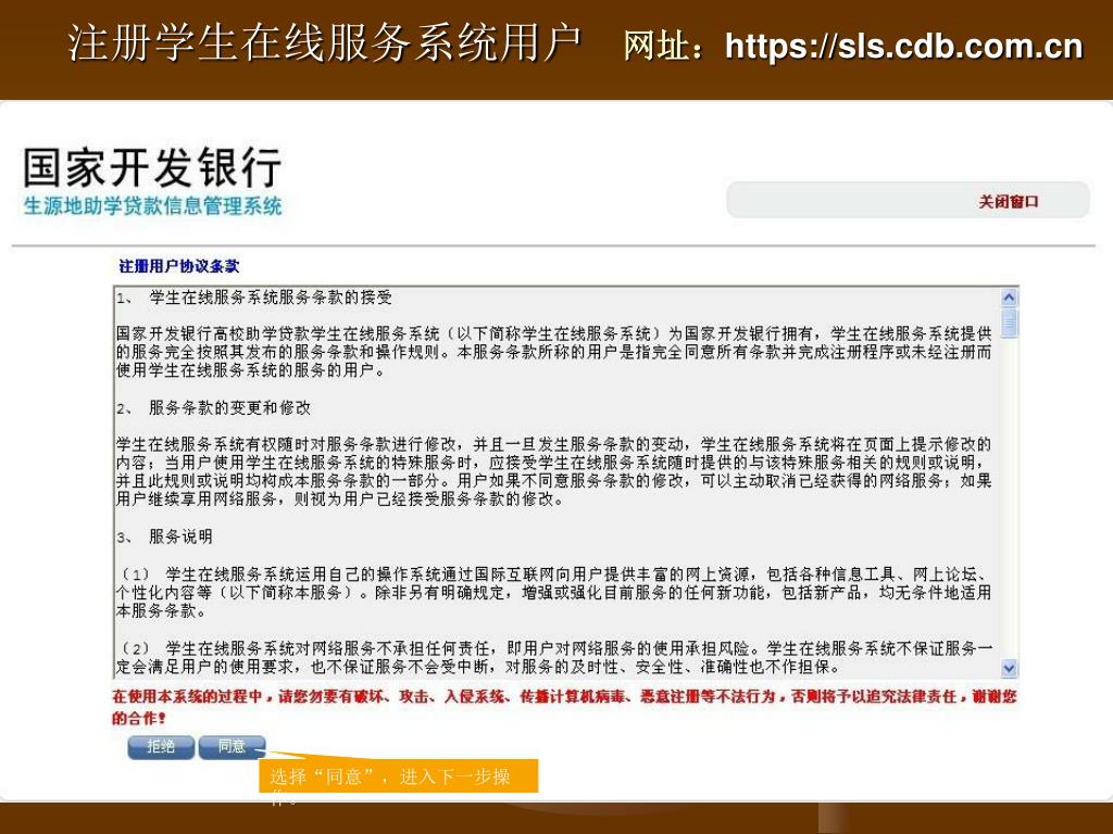 注册学生在线服务系统用户 网址:https://sls.cdb.com.cn 选择“同意”,进入下一步操作。