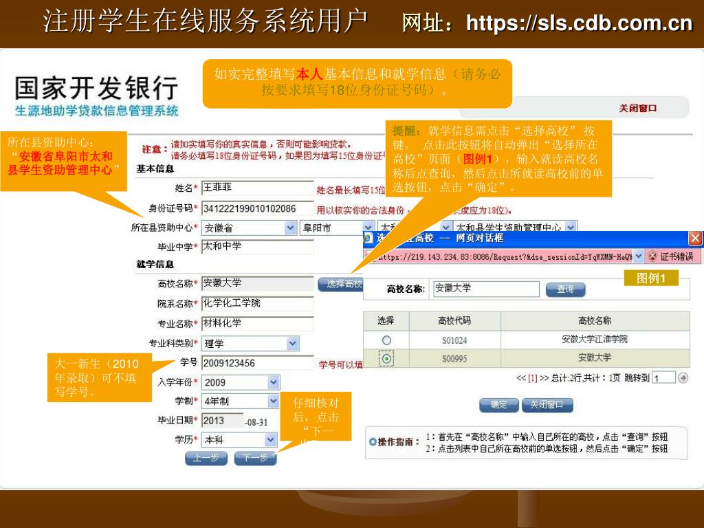 注册学生在线服务系统用户 网址:https://sls.cdb.com.cn 如实完整填写本人基本信息和就学信息(请务必按要求填写18位身份证号码)。 提醒:就学信息需点击“选择高校” 按键。 点击此按钮将自动弹出“选择所在高校”页面(图例1),输入就读高校名称后点查询,然后点击所就读高校前的单选按钮,点击“确定”。 所在县资助中心:“安徽省阜阳市太和县学生资助管理中心” 图例1 大一新生(2010年录取)可不填写学号。 仔细核对后,点击“下一步”。