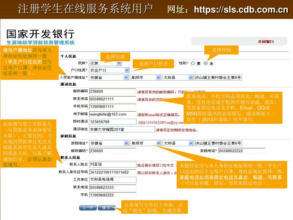 注册学生在线服务系统用户 网址:https://sls.cdb.com.cn 填写户籍地址应与本人身份证住址保持一致(学生户口迁出的应与父母户口薄、身份证住址保持一致)。 选择性别 选择民族 选择户口性质 联系电话、手机号码必须真实、畅通、可联系,没有电话或手机的可填写亲戚、朋友、邻居家固定电话及手机。Email、QQ或MSN即时通讯的必须填写。通讯地址大一新生( 2013年录取)可不填写。 此处填写第三方联系人(与贷款业务本身毫无关联)。主要目的:当出现因贷款事宜无法直接联系到学生本人或共同借款人时,以备了解、通知信息。必须认真如实填写。 家庭住址应与本人身份证地址保持一致(学生户口迁出的应于父母户口薄、身份证地址保持一致,家庭电话必须是固定电话且真实、畅通、可联系(可以是亲戚、朋友、邻居家固定电话)。 认真填写完毕以上内容,点击“提交”按钮,完成注册。