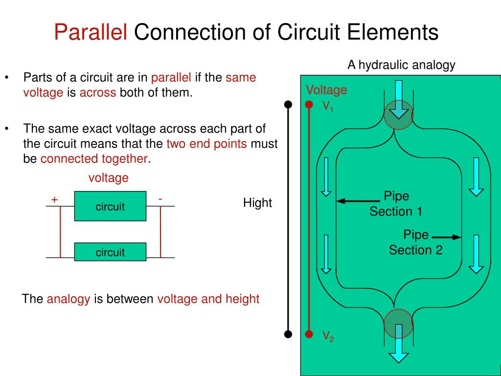 Parallel Connection of Circuit Elements A hydraulic analogy Voltage • Parts of a circuit are in parallel if the same voltage is across both of them. • The same exact voltage across each part of the circuit means that the two end points must be connectedtogether. V1 Hight voltage + - circuit The analogy is between voltage and height circuit V2