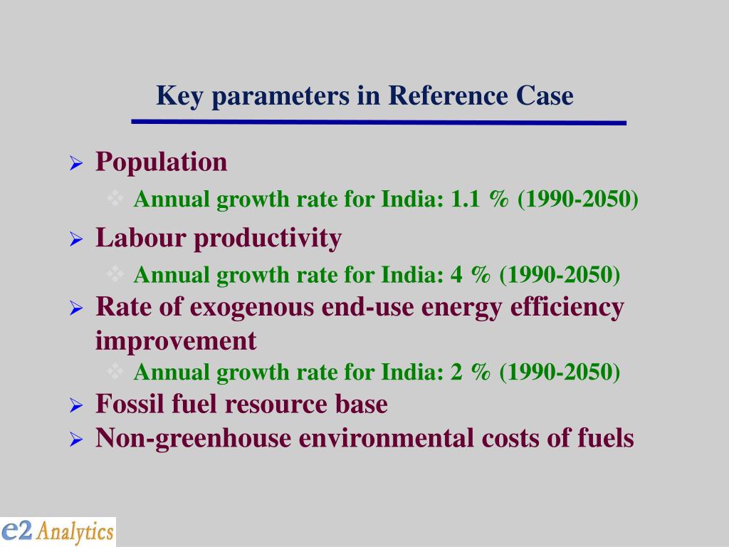 Key parameters in Reference Case • Population • Annual growth rate for India: 1.1 % (1990-2050) • Labour productivity • Annual growth rate for India: 4 % (1990-2050) • Rate of exogenous end-use energy efficiency improvement • Annual growth rate for India: 2 % (1990-2050) • Fossil fuel resource base • Non-greenhouse environmental costs of fuels