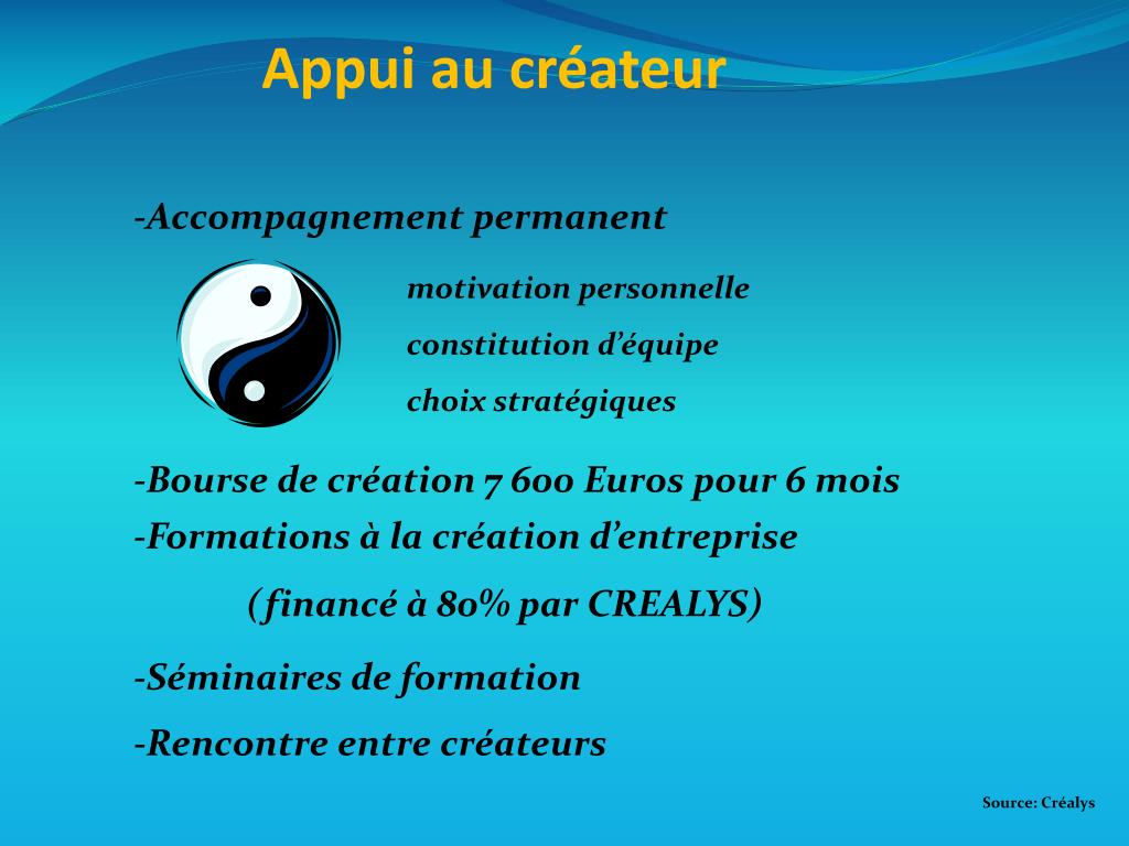 Appui au créateur -Accompagnement permanent motivation personnelle constitution d’équipe choix stratégiques -Bourse de création 7 600 Euros pour 6 mois -Formations à la création d’entreprise (financé à 80% par CREALYS) -Séminaires de formation -Rencontre entre créateurs Source: Créalys