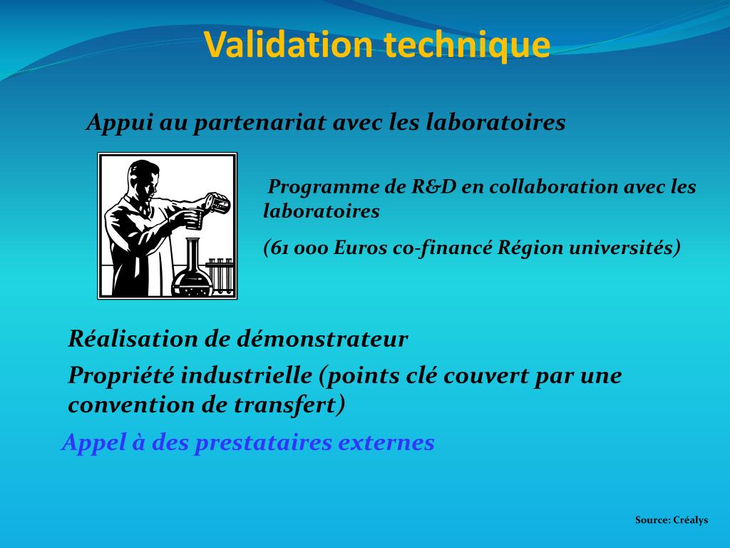 Validation technique Appui au partenariat avec les laboratoires Programme de R&D en collaboration avec les laboratoires (61 000 Euros co-financé Région universités) Réalisation de démonstrateur Propriété industrielle (points clé couvert par une convention de transfert) Appel à des prestataires externes Source: Créalys