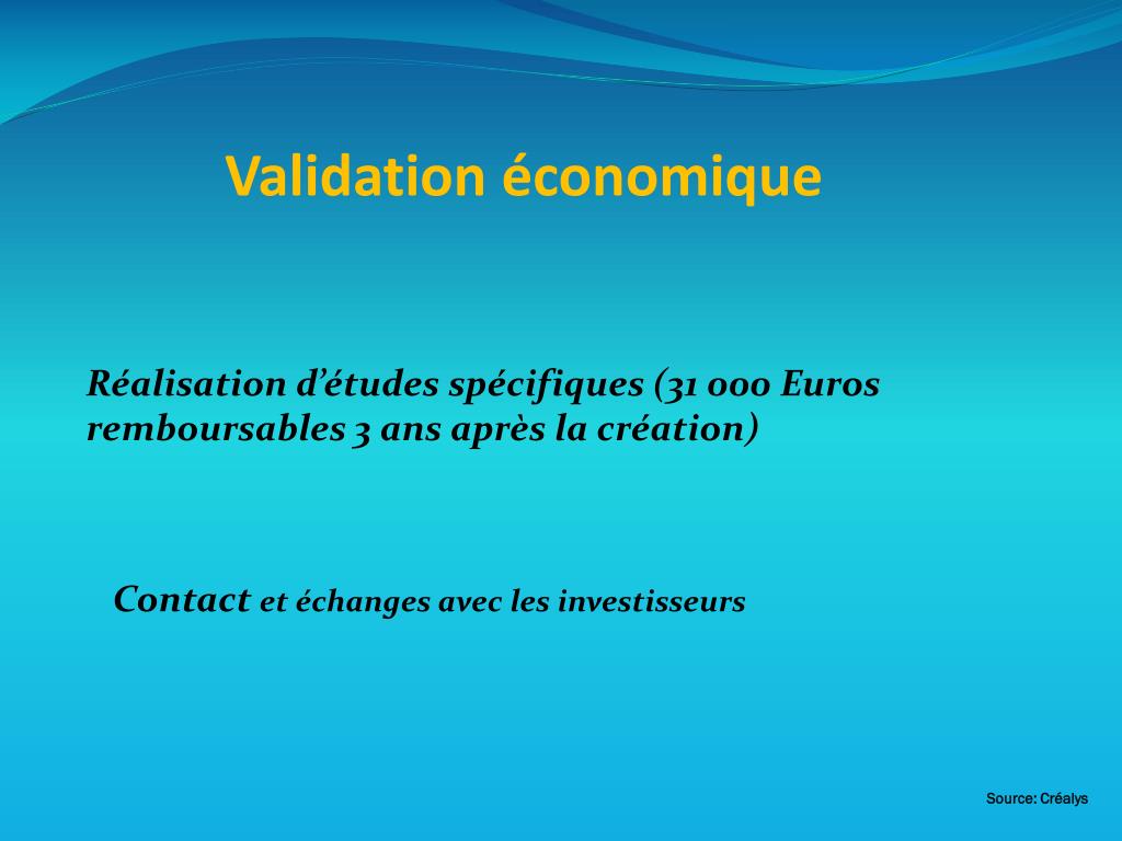 Validation économique Réalisation d’études spécifiques (31 000 Euros remboursables 3 ans après la création) Contact et échanges avec les investisseurs Source: Créalys