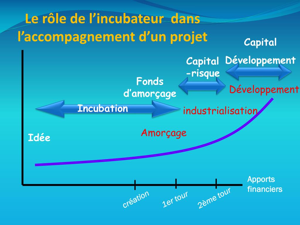 Le rôle de l’incubateur dans l’accompagnement d’un projet Capital Développement Capital-risque Fonds d’amorçage Développement Incubation industrialisation Amorçage Idée Apports financiers 1er tour 2ème tour création
