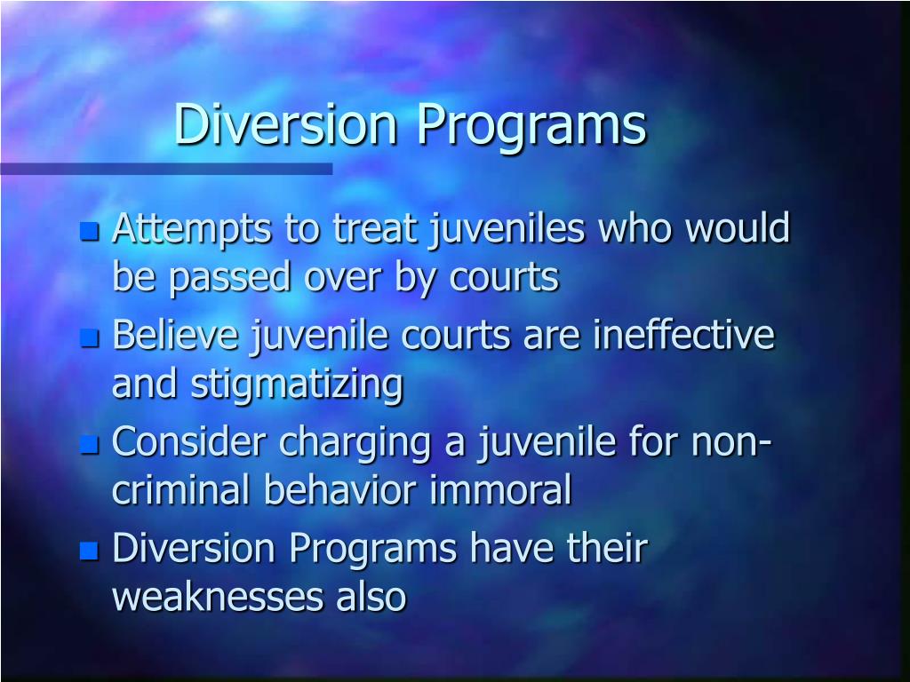 Diversion Programs • Attempts to treat juveniles who would be passed over by courts • Believe juvenile courts are ineffective and stigmatizing • Consider charging a juvenile for non-criminal behavior immoral • Diversion Programs have their weaknesses also