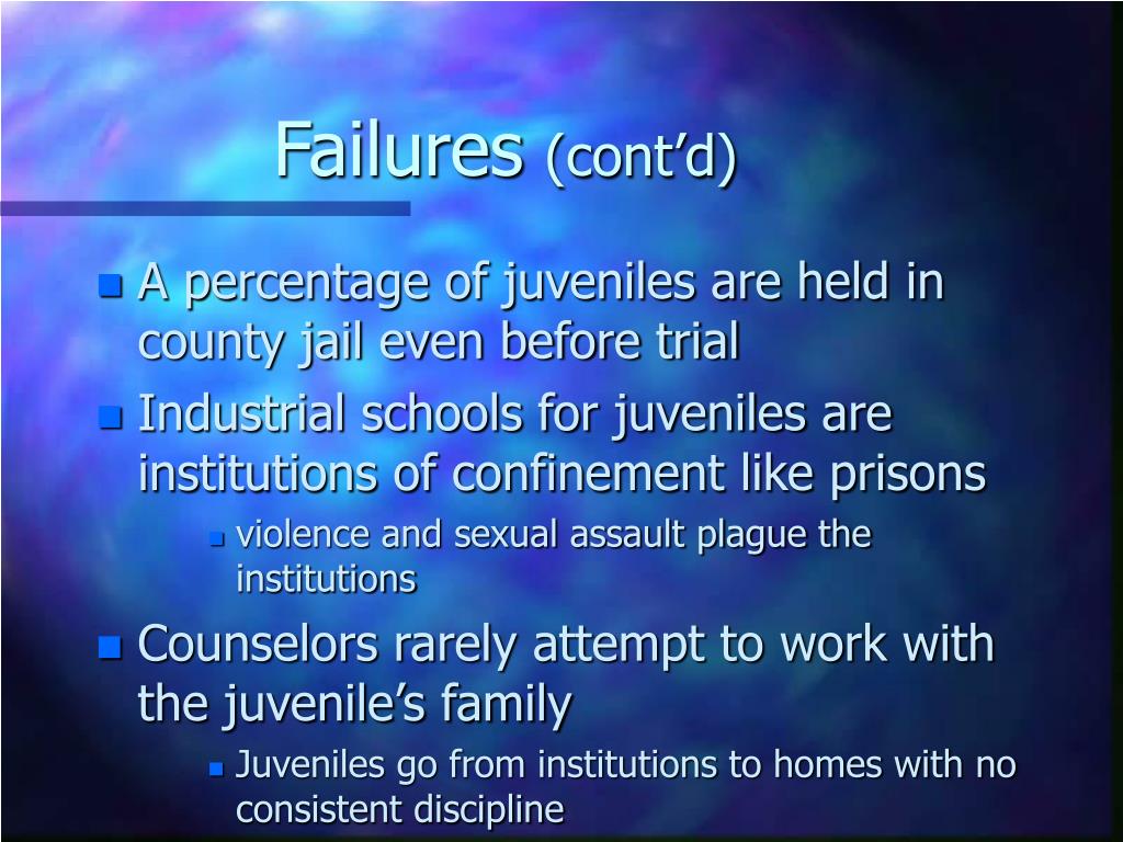 Failures(cont’d) • A percentage of juveniles are held in county jail even before trial • Industrial schools for juveniles are institutions of confinement like prisons • violence and sexual assault plague the institutions • Counselors rarely attempt to work with the juvenile’s family • Juveniles go from institutions to homes with no consistent discipline