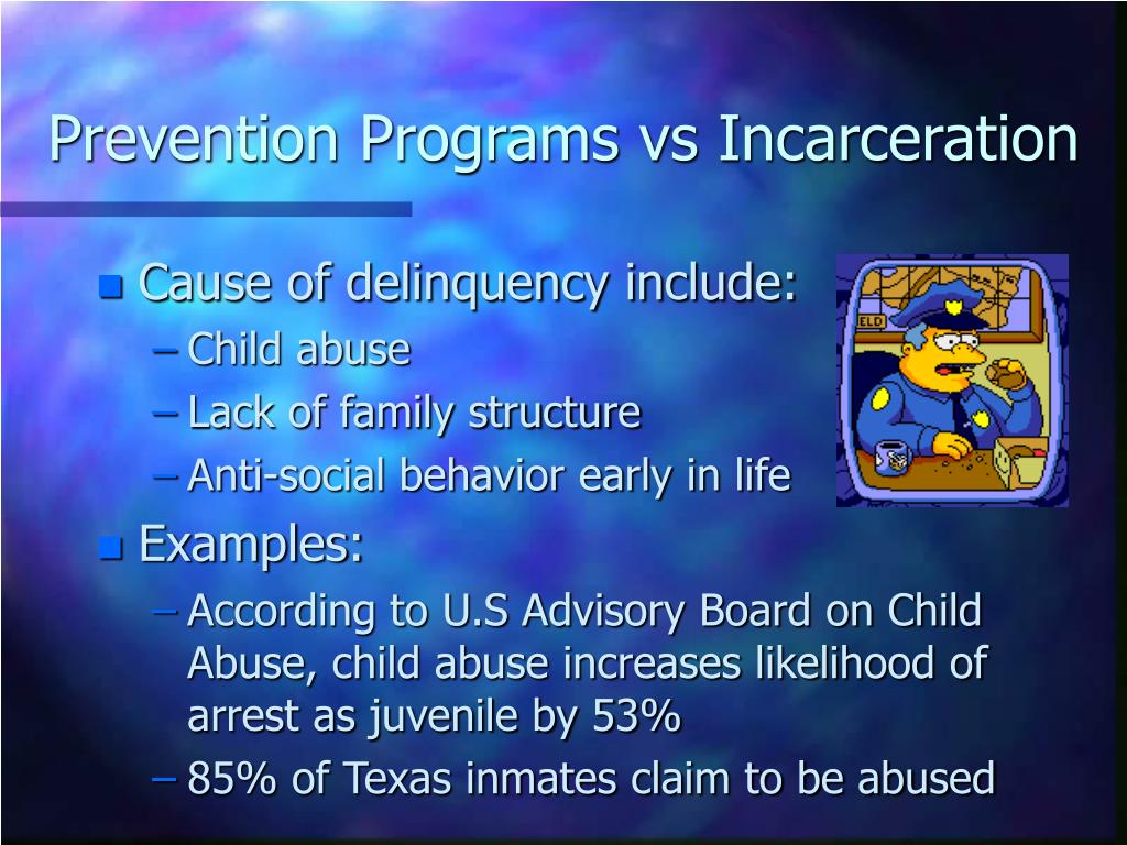 Prevention Programs vs Incarceration • Cause of delinquency include: • Child abuse • Lack of family structure • Anti-social behavior early in life • Examples: • According to U.S Advisory Board on Child Abuse, child abuse increases likelihood of arrest as juvenile by 53% • 85% of Texas inmates claim to be abused
