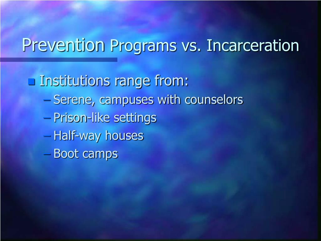 Prevention Programs vs. Incarceration • Institutions range from: • Serene, campuses with counselors • Prison-like settings • Half-way houses • Boot camps