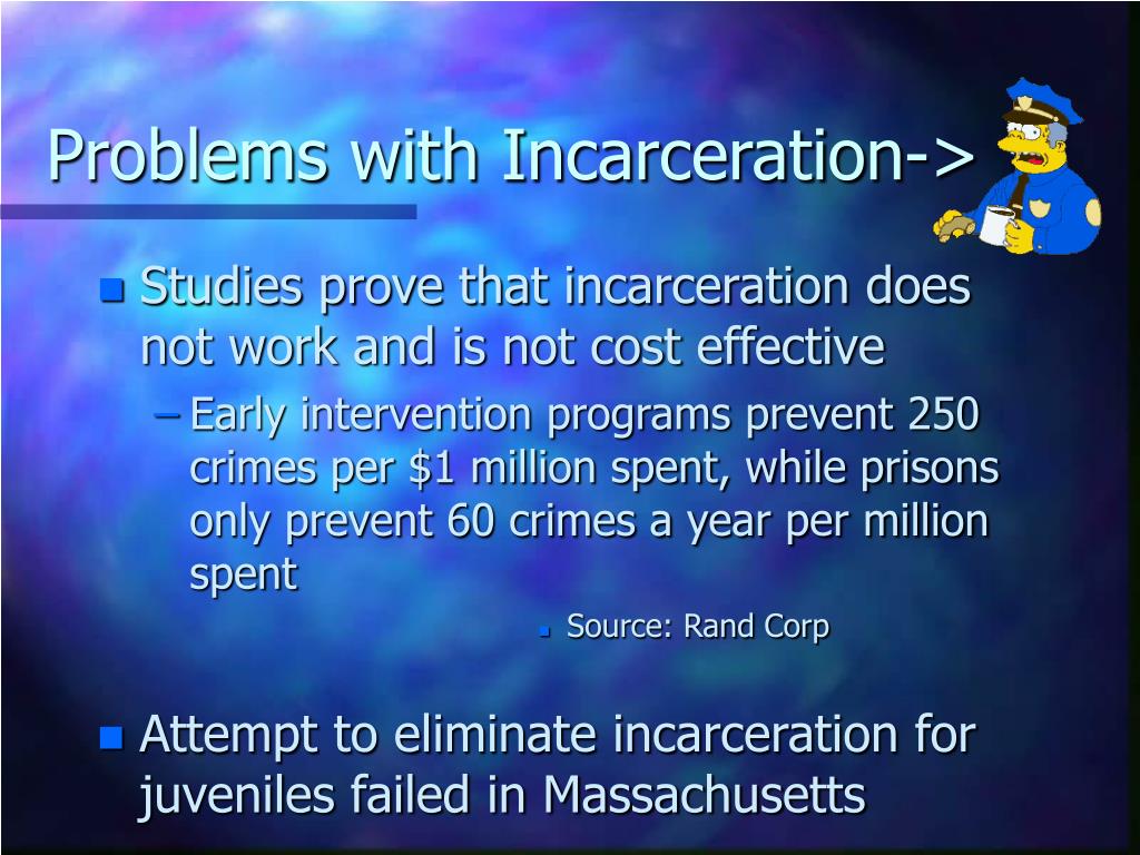 Problems with Incarceration-> • Studies prove that incarceration does not work and is not cost effective • Early intervention programs prevent 250 crimes per $1 million spent, while prisons only prevent 60 crimes a year per million spent • Source: Rand Corp • Attempt to eliminate incarceration for juveniles failed in Massachusetts