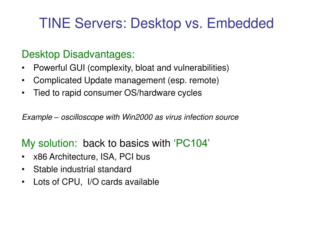 PC104 with embedded Linux Trips and Ticks. S. Herb, MSC, Desy Tine Workshop, Sept 2007. TINE Servers: Desktop vs. Embedded. History: Main Line of Development was with Desktop PCs DOS Win3.1 WfW WinNT WinXP ... Wista? (but also significant Unix, vxWorks …) Desktop Advantages: