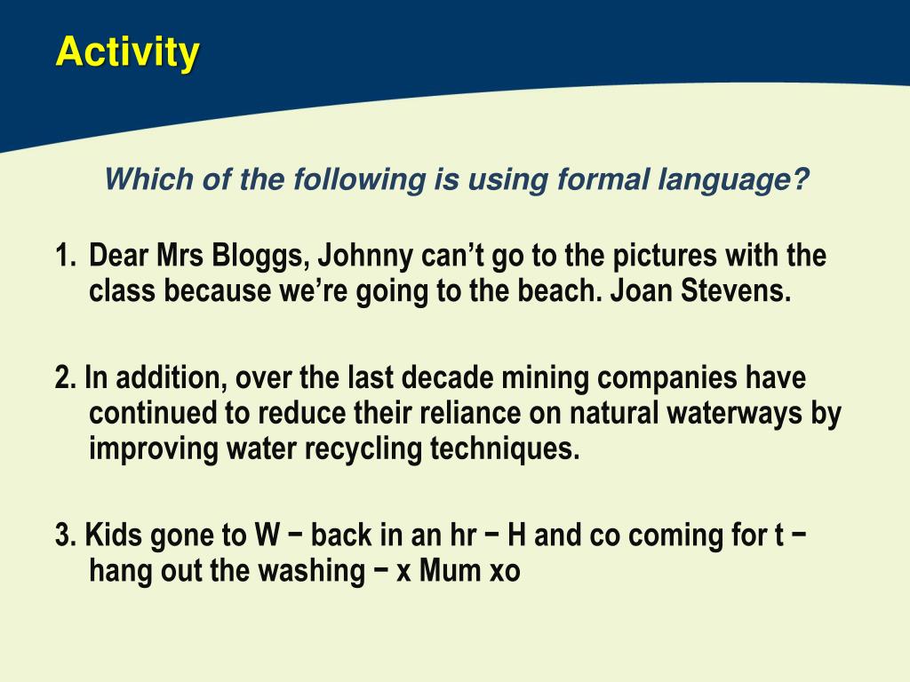 Activity Which of the following is using formal language? • Dear Mrs Bloggs, Johnny can’t go to the pictures with the class because we’re going to the beach. Joan Stevens. 2. In addition, over the last decade mining companies have continued to reduce their reliance on natural waterways by improving water recycling techniques. 3. Kids gone to W − back in an hr − H and co coming for t − hang out the washing − x Mum xo