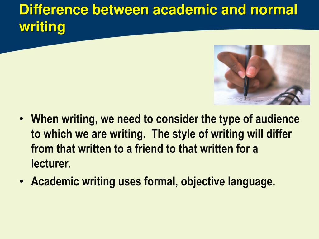 Difference between academic and normal writing • When writing, we need to consider the type of audience to which we are writing. The style of writing will differ from that written to a friend to that written for a lecturer. • Academic writing uses formal, objective language.