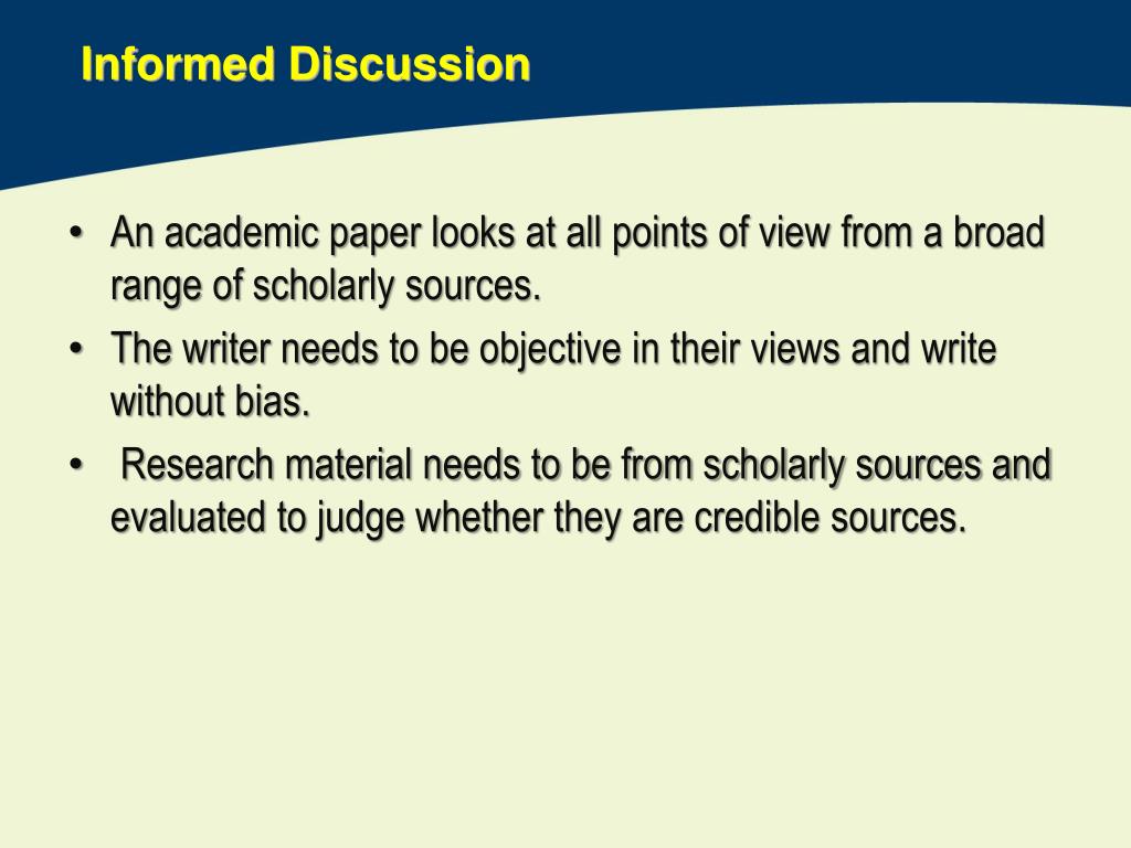 Informed Discussion • An academic paper looks at all points of view from a broad range of scholarly sources. • The writer needs to be objective in their views and write without bias. • Research material needs to be from scholarly sources and evaluated to judge whether they are credible sources.