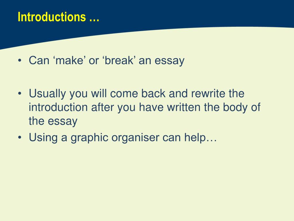 Introductions … • Can ‘make’ or ‘break’ an essay • Usually you will come back and rewrite the introduction after you have written the body of the essay • Using a graphic organiser can help…
