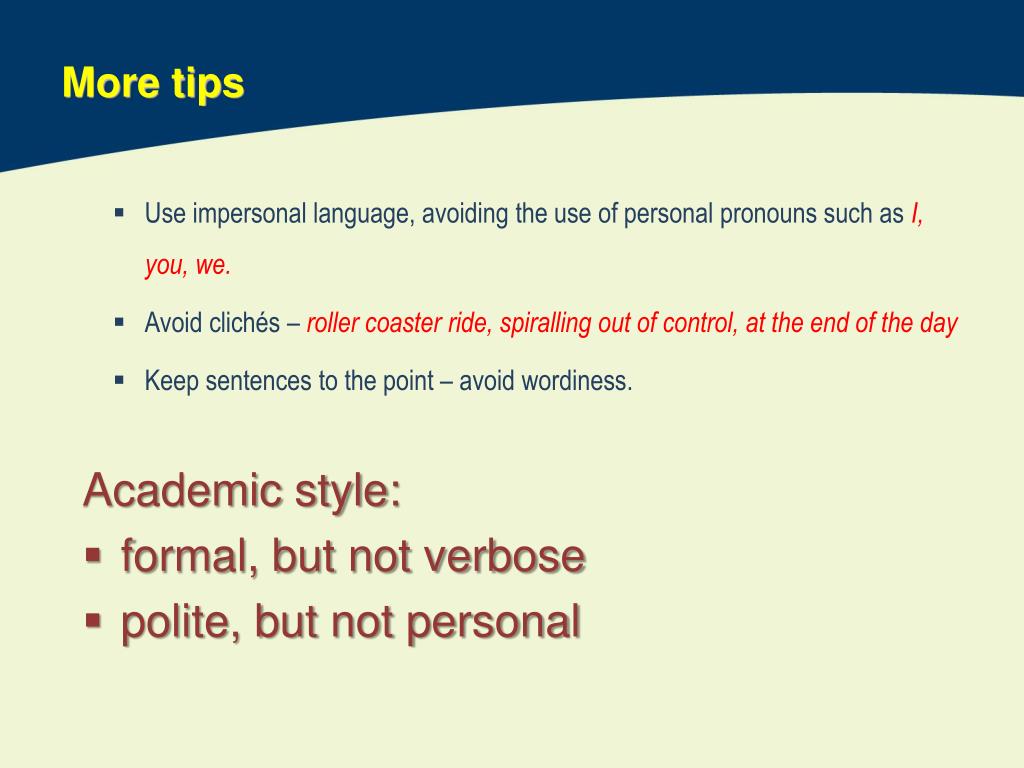 More tips • Use impersonal language, avoiding the use of personal pronouns such as I, you, we. • Avoid clichés – roller coaster ride, spiralling out of control, at the end of the day • Keep sentences to the point – avoid wordiness. • Academic style: • formal, but not verbose • polite, but not personal