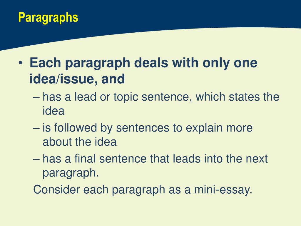 Paragraphs • Each paragraph deals with only one idea/issue, and • has a lead or topic sentence, which states the idea • is followed by sentences to explain more about the idea • has a final sentence that leads into the next paragraph. Consider each paragraph as a mini-essay.