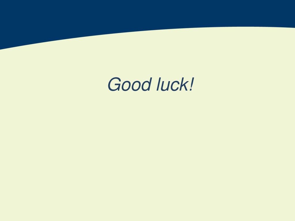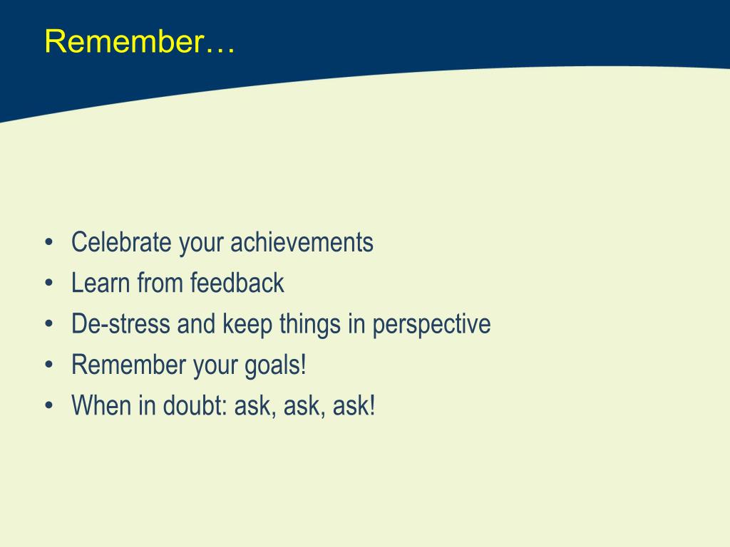 Remember… • Celebrate your achievements • Learn from feedback • De-stress and keep things in perspective • Remember your goals! • When in doubt: ask, ask, ask!