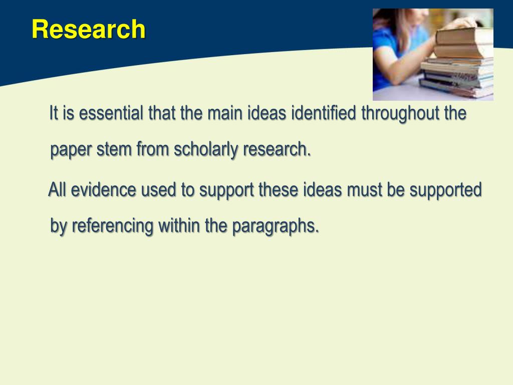Research It is essential that the main ideas identified throughout the paper stem from scholarly research. All evidence used to support these ideas must be supported by referencing within the paragraphs.