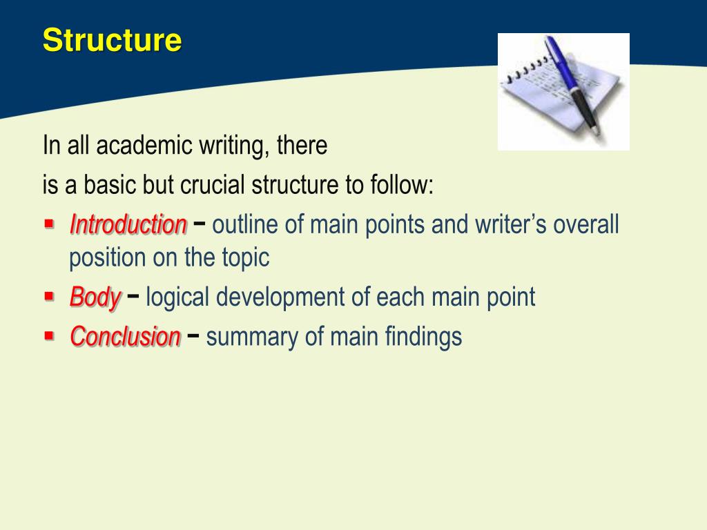 Structure In all academic writing, there is a basic but crucial structure to follow: • Introduction − outline of main points and writer’s overall position on the topic • Body − logical development of each main point • Conclusion − summary of main findings