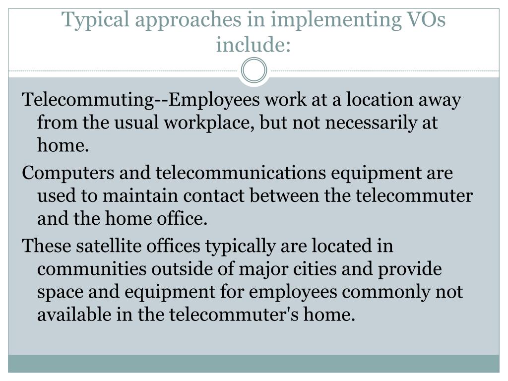 Typical approaches in implementing VOs include: Telecommuting--Employees work at a location away from the usual workplace, but not necessarily at home. Computers and telecommunications equipment are used to maintain contact between the telecommuter and the home office. These satellite offices typically are located in communities outside of major cities and provide space and equipment for employees commonly not available in the telecommuter's home.