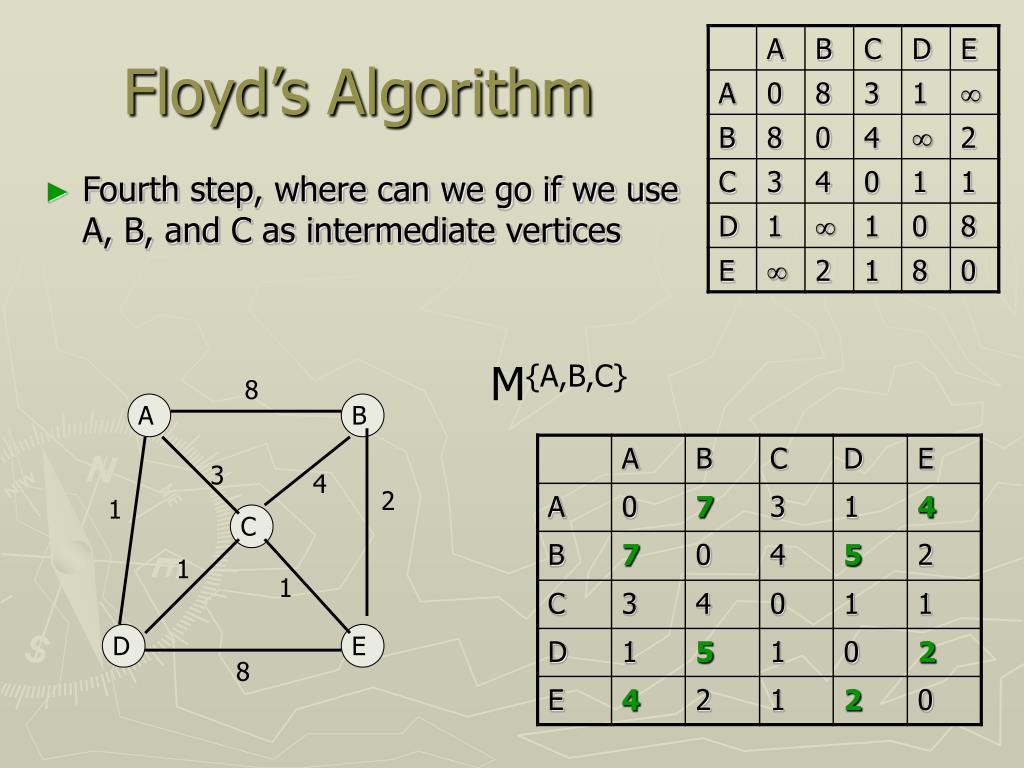 8 3 4 1 2 A B C D E 1 1 8 Floyd’s Algorithm • Fourth step, where can we go if we use A, B, and C as intermediate vertices M{A,B,C}
