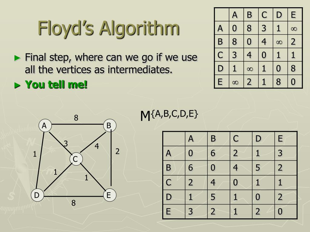 8 3 4 1 2 A B C D E 1 1 8 Floyd’s Algorithm • Final step, where can we go if we use all the vertices as intermediates. • You tell me! M{A,B,C,D,E}