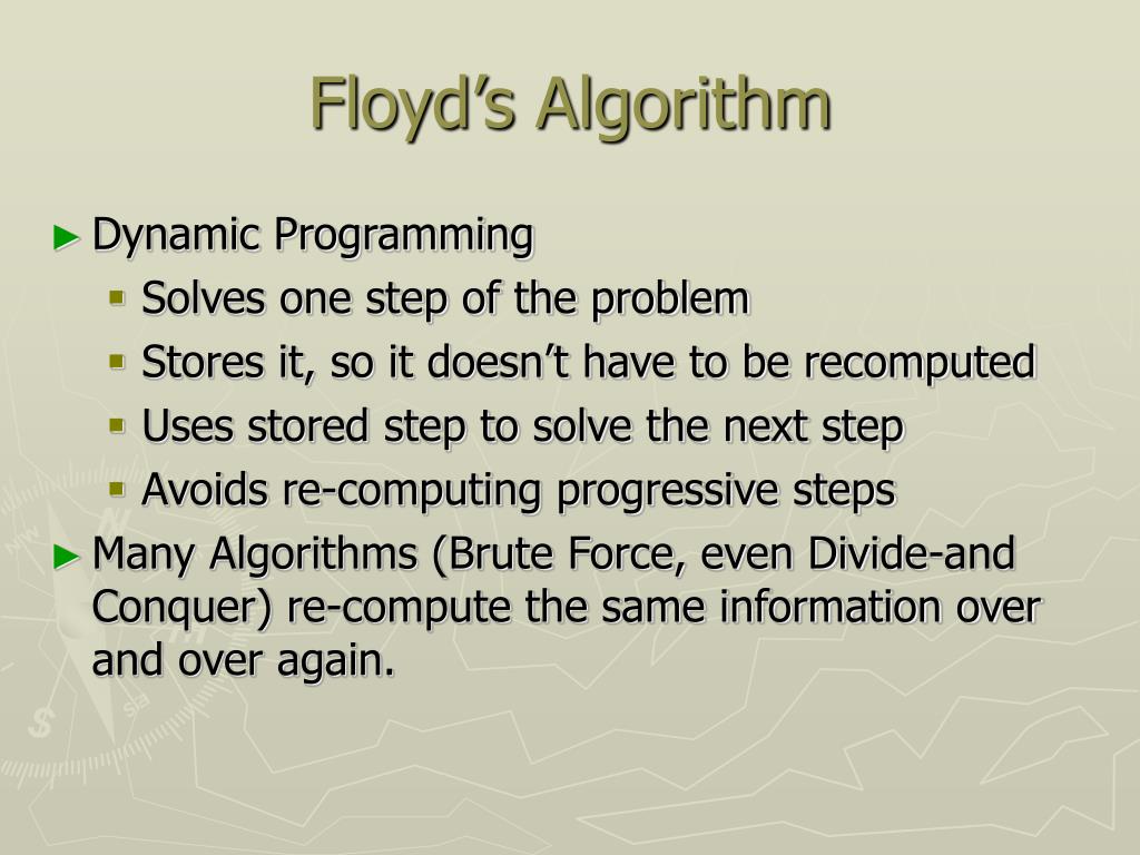 Floyd’s Algorithm • Dynamic Programming • Solves one step of the problem • Stores it, so it doesn’t have to be recomputed • Uses stored step to solve the next step • Avoids re-computing progressive steps • Many Algorithms (Brute Force, even Divide-and Conquer) re-compute the same information over and over again.