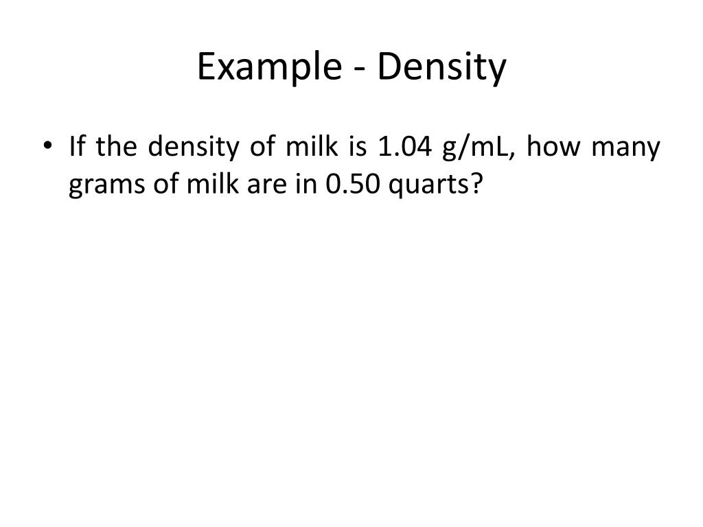 Example - Density • If the density of milk is 1.04 g/mL, how many grams of milk are in 0.50 quarts?