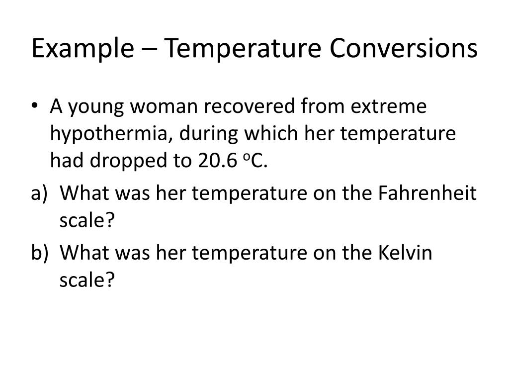 Example – Temperature Conversions • A young woman recovered from extreme hypothermia, during which her temperature had dropped to 20.6 oC. • What was her temperature on the Fahrenheit scale? • What was her temperature on the Kelvin scale?