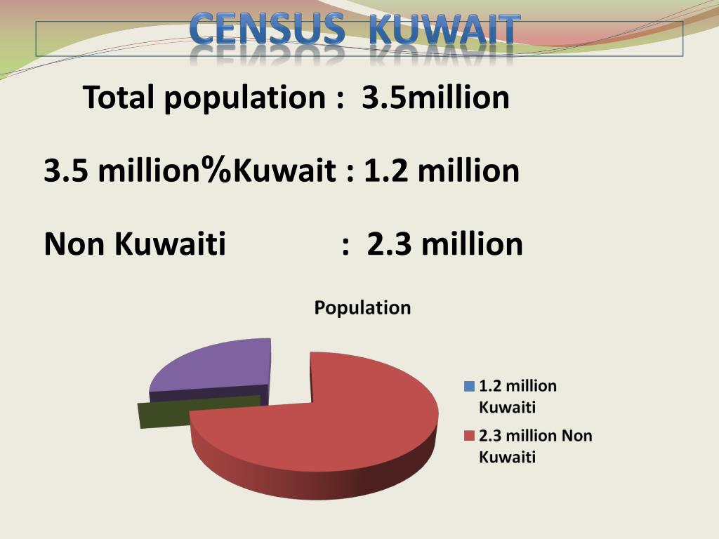 CENSUS KUWAIT Total population : 3.5million 3.5 million%Kuwait : 1.2 million Non Kuwaiti : 2.3 million