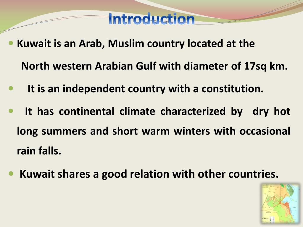 Introduction • Kuwait is an Arab, Muslim country located at the North western Arabian Gulf with diameter of 17sq km. • It is an independent country with a constitution. • It has continental climate characterized by dry hot long summers and short warm winters with occasional rain falls. • Kuwait shares a good relation with other countries.
